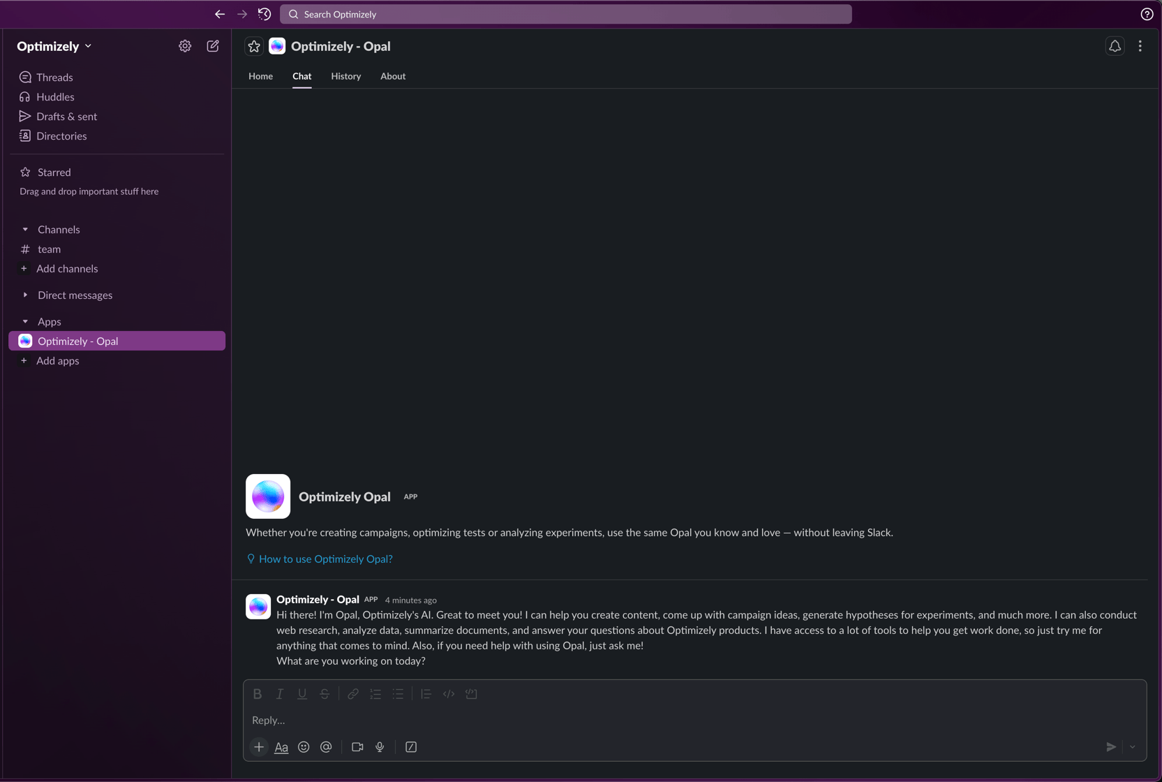 Interact with Optimizely Opal from within Slack! Whether you're creating campaigns, optimizing tests or analyzing experiments, you can now use the same Opal you know and love—without having to leave Slack.