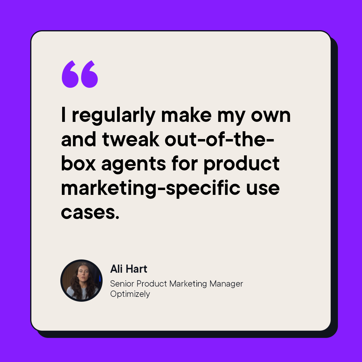 Built for marketers, the agent orchestration platform requires ZERO help from dev to create or deploy agents. I regularly make my own and tweak out-of-the-box agents for product marketing-specific use cases.' - Ali Hart, Product Marketing Manager @ Optimizely