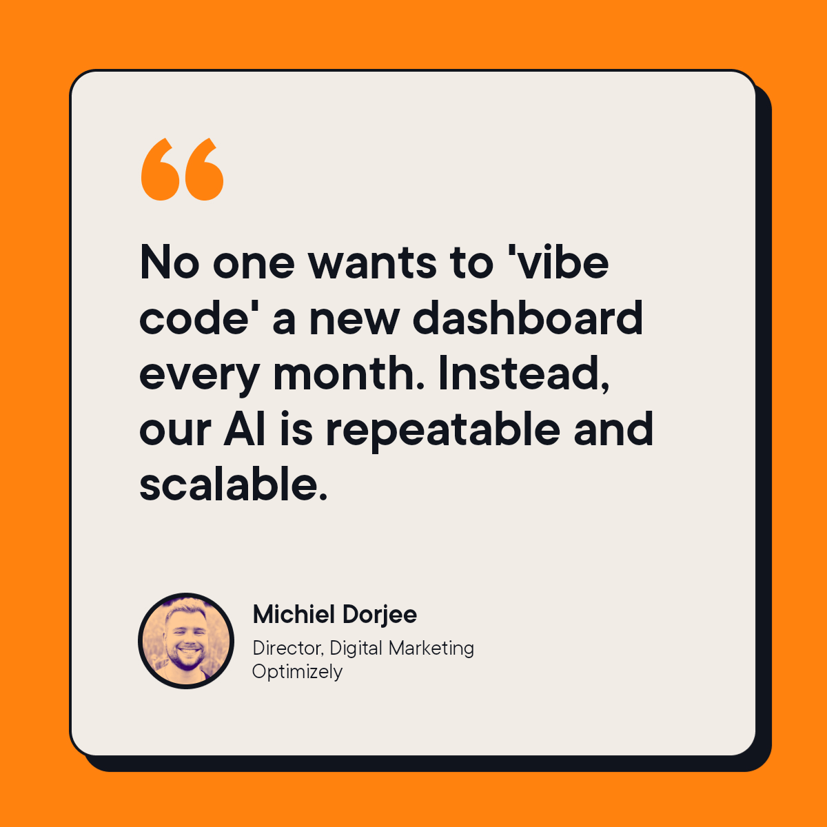 No one wants to 'vibe code' a new dashboard every month. Instead, our AI is repeatable, scalable and democratizes access to knowledge" - Michiel Dorjee, Director, Digital Marketing @ Optimizely
