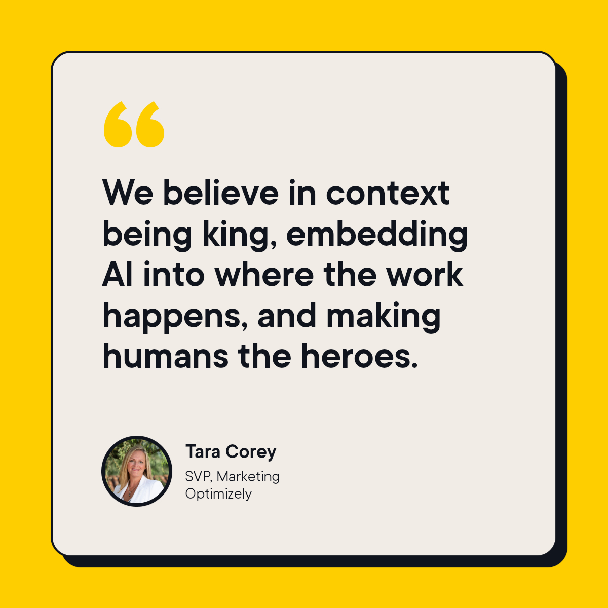 "We believe in context being king, embedding AI into where the work happens, helping to connect and empower teams, and making humans the heroes." - Tara Corey, SVP, Marketing @ Optimizely