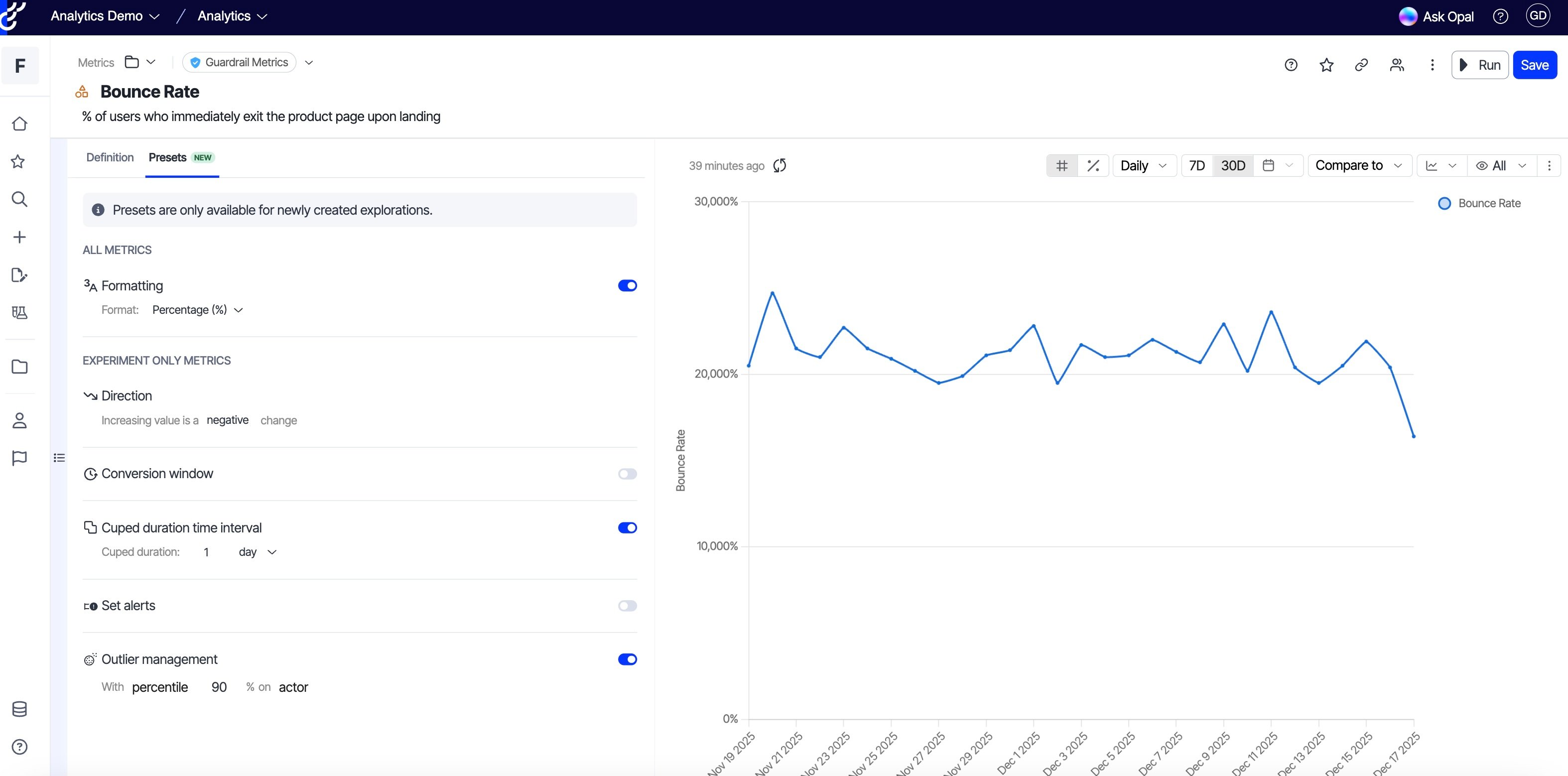 Die Ausreißerglättung hilft, durch Ausreißer verursachte verzerrte Ergebnisse von Experimenten zu vermeiden. Diese Funktion, die derzeit für Umsatzmetriken in Experimentieren verfügbar ist, wird auf alle numerischen Metriken in Analytics ausgeweitet. Sie können die Werte entweder auf einen bestimmten Schwellenwert begrenzen oder sie auf der Grundlage von Perzentilen glätten, um eine genauere Analyse zu gewährleisten.