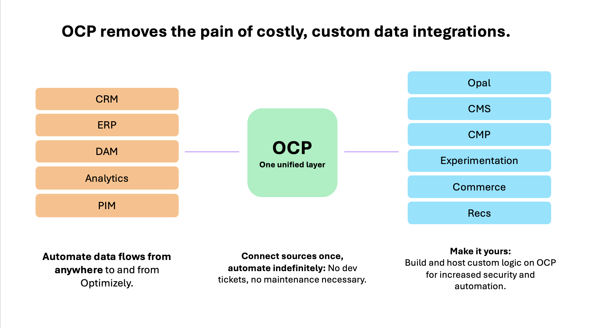 OCP connects all of your product and customer data from you CRM, CDP, PIM, ERP, analytics, and content systems to every Optimizely product — from Opal and CMS to Commerce and Experimentation. It’s how brands turn disconnected tools into a connected, intelligent ecosystem.