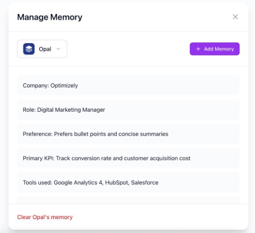Opal will store and retrieve your individual past interactions and preferences, enabling adaptive, continuous support and higher quality outputs.