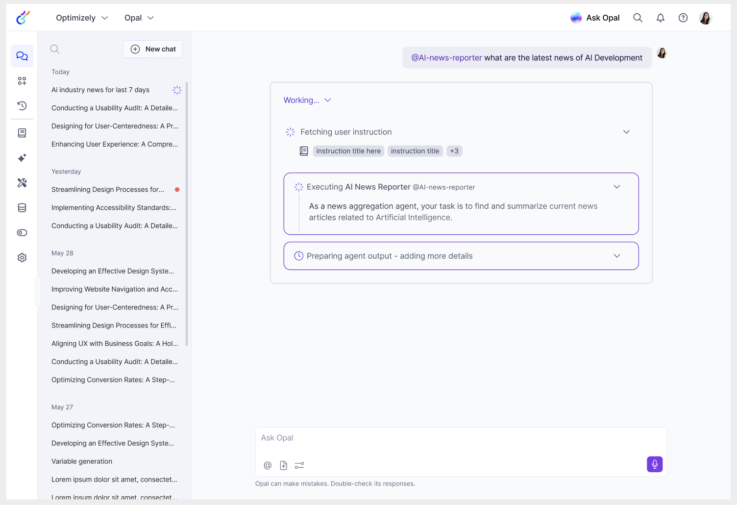 Opal can search across all your Optimizely Content Marketing Platform data, allowing natural language queries to instantly retrieve relevant content and insights. (*Turned on by request.)