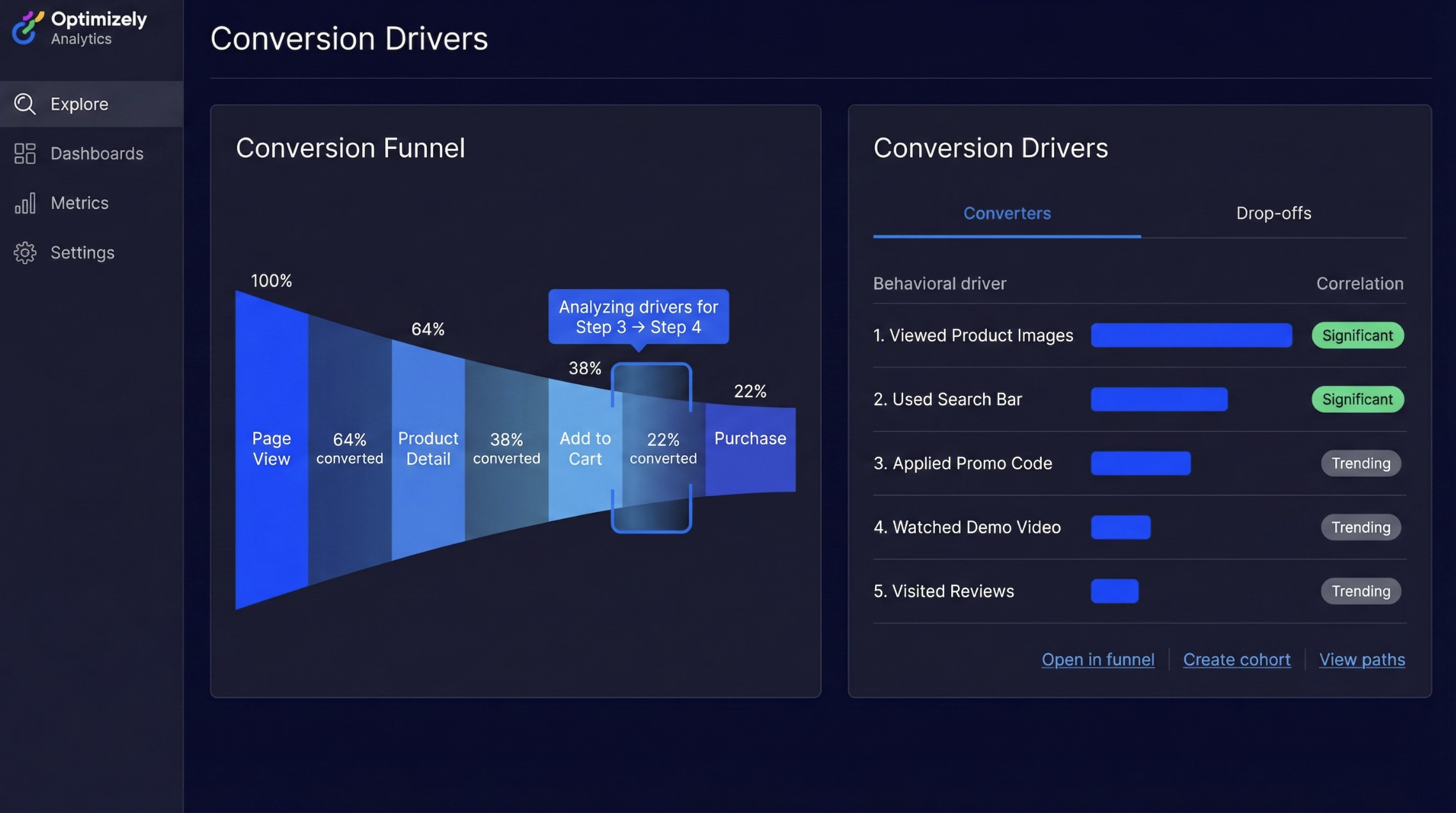 • Connects directly to segmented funnels, path analyses, and cohorts from any driver result