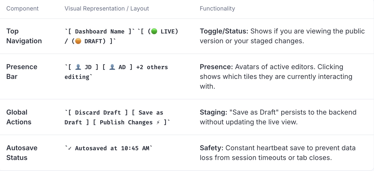 • Edit safely in private drafts without affecting live dashboards.