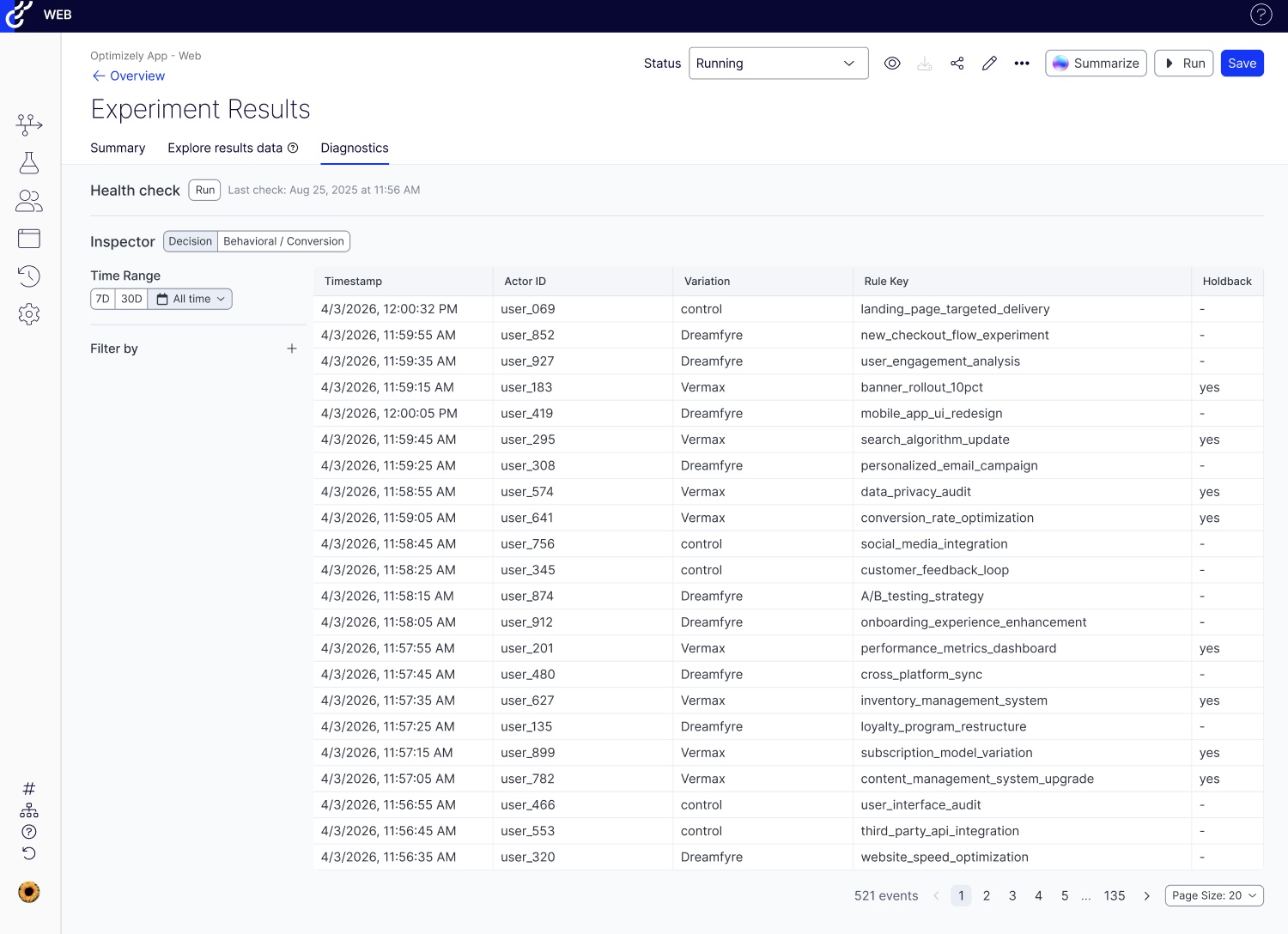 • Confirm experiments are live and reaching users with a real-time decision stream