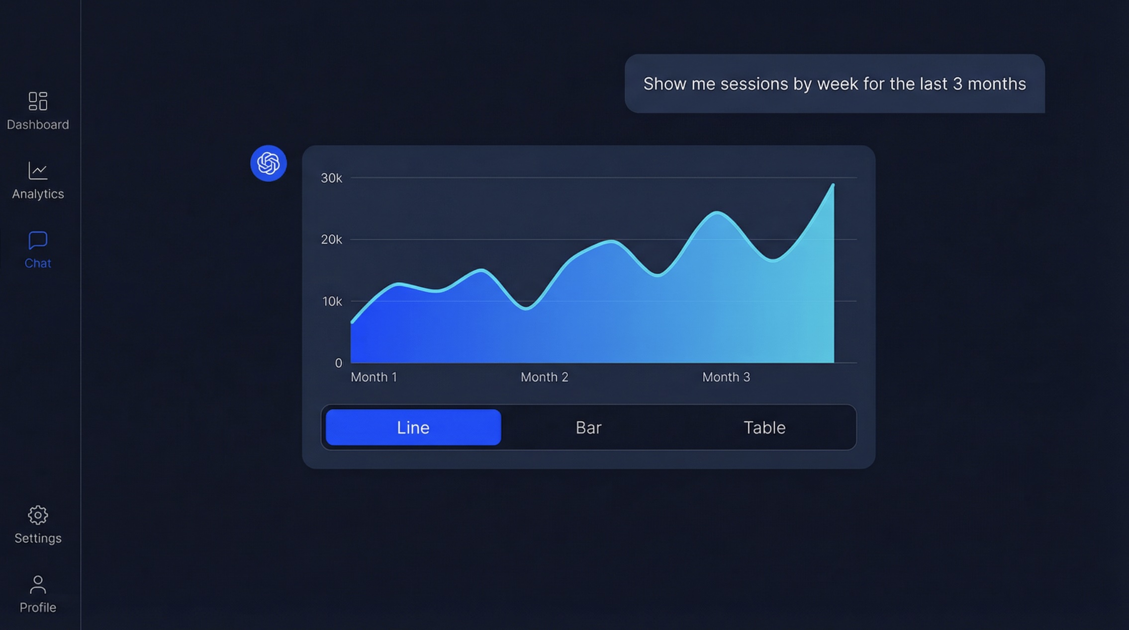 • Toggle between bar, line, and table view instantly, no additional queries