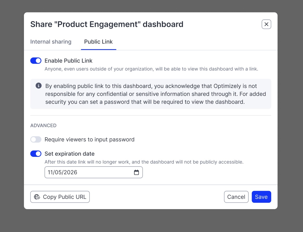 • Instantly share dashboards and experiment results using customizable, password-protected, and auto-expiring links.