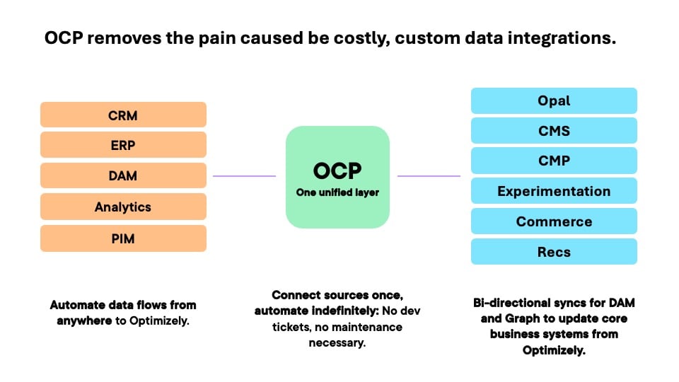 OCP connects all of your product and customer data from you CRM, CDP, PIM, ERP, analytics, and content systems to Optimizely — from Opal and CMS, and in the near future, Commerce and Experimentation and more. It’s how brands turn disconnected tools into a connected, intelligent ecosystem.