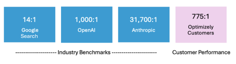 Analysis of internal data shows that when LLMs crawl Optimizely customer sites, that crawl activity converts into referrals far more efficiently, resulting in an average crawl-to-refer ratio of 775:114 across answer engines, 29% better than the typical OpenAI-crawled site and nearly 40× better than the typical Anthropic-crawled site.