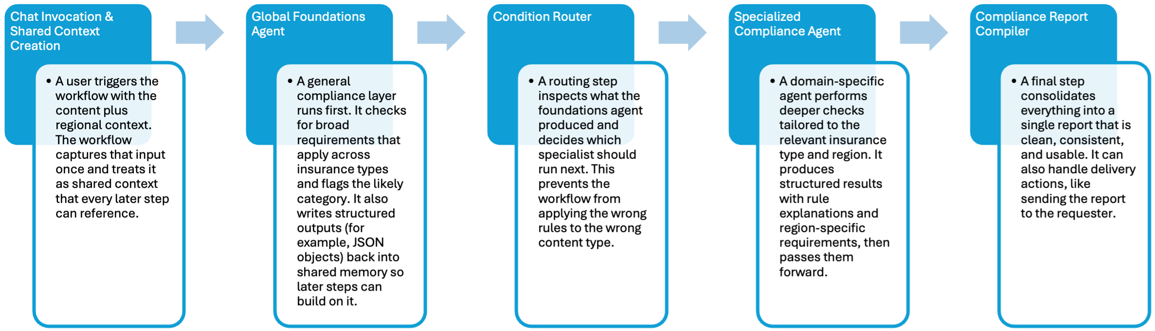 Compliance is also well suited to AI because it is rules-based, repeatable, and high-risk when errors slip through. But it is rarely a single check. It requires multiple steps, specialist logic, and consistent handoffs. That makes it ideal for an agentic workflow that coordinates the process end to end rather than treating compliance as a one-off task.