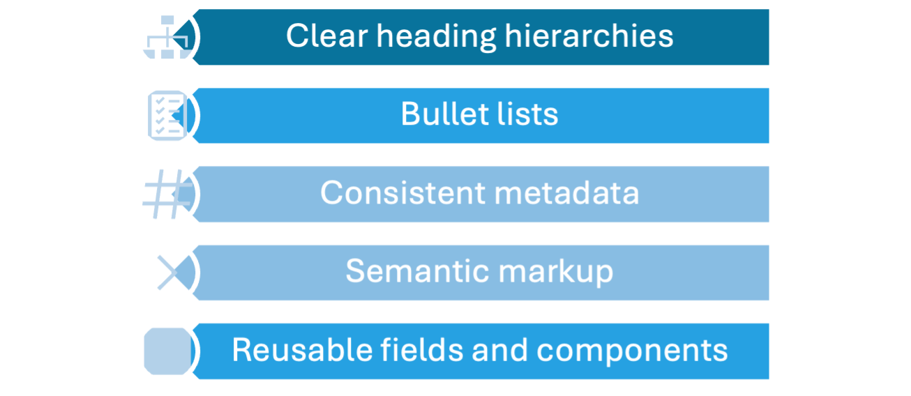 This requires moving away from long, unstructured pages and toward modular content made up of reusable fields and components. Each element should stand on its own, be easy to extract, and follow consistent patterns that AI systems can reliably interpret.