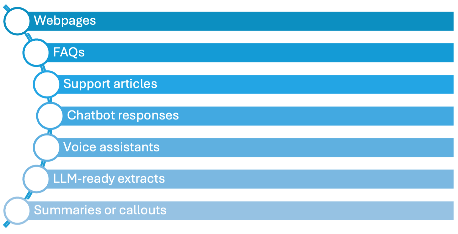 Structured, component-based content replaces monolithic pages with modular building blocks that carry clear meaning, consistent metadata, and predictable formatting. These blocks become a single source of truth that can power webpages, FAQs, support articles, chatbot responses, voice assistants, LLM-ready extracts, and every downstream experience that depends on accurate information.